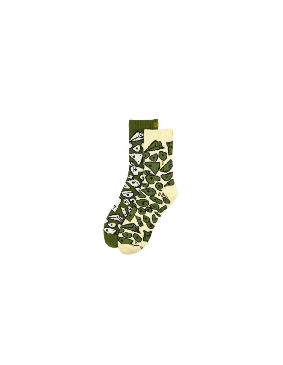 Rock Socks Spray Wall are comfortable and stylish lifestyle socks that let you carry a piece of the climbing wall with you – playful holds peeking out at your ankles. Made from a blend of combed cotton, polyester, and elastane, they are both soft and durable. Whether at work, at home, or on the move, these socks provide comfort and support. They are not designed to be worn inside climbing shoes.