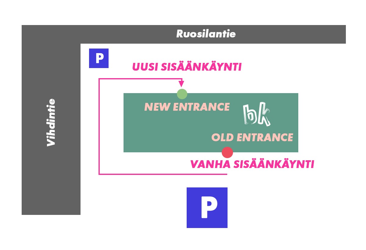 Huom! Konalalla on uusi sisäänkäynti Ruosilantien puolella! Aukioloaikojen ulkopuolella vuosijäseniä ja Premium-korttilaisia palvelee sama tuttu ovi. Myös pysäköintialue on sama kuin ennen. Ks. havainnekuva alta.